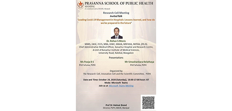 Research Cell, Innovation Cell and the Scientific Committee of PSPH organized an e-interaction with Dr Rohan S Monis (Chief Administrative Medical Officer, Kanachur Hospital and Research Centre, Mangalore) on ‘Leading COVID-19 Management in Hospitals: Lessons learned, and how do we be prepared in the future’ on October 24, 2020 (16:00 to 17:00 hrs IST).