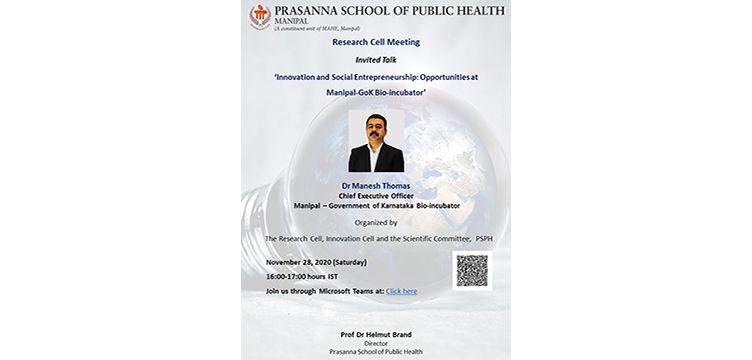 The Research Cell, Innovation Cell and the Scientific Committee of PSPH are organizing an invited talk on "Innovation and Social Entrepreneurship: Opportunities at Manipal-GoK Bio-incubator" through Microsoft Teams on November 28, 2020 (Saturday) during 16:00-17:00 hours IST.