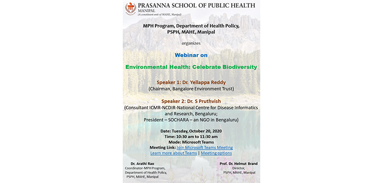 MPH Program, Department of Health Policy, Prasanna School of Public Health, MAHE, Manipal is Organizing a Webinar on 'Environmental Health : Celebrate Biodiversity' on October 20, 2020 through Microsoft Teams. Dr. Yellappa Reddy (Chairman, Bangalore Environment Trust), Dr. S Pruthvish (Consultant ICMR-NCDIR-National Centre for Disease Informatics and Research, Bengaluru; President - SOCHARA - an NGO in Bengaluru) will be the Speakers for the Webinar.