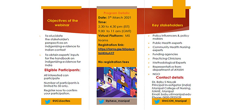 The SPARC Project Team (Manipal College of Nursing and Public Health Evidence South Asia, Prasanna School of Public Health) in collaboration with UCL Social Research Institute, University College London, UK is organizing a webinar on ‘Indigenizing Systematic Review Evidence for Policy Decisions in India’ on March 05, 2021 (14:30 to 16:30 hours IST) through Microsoft Teams.