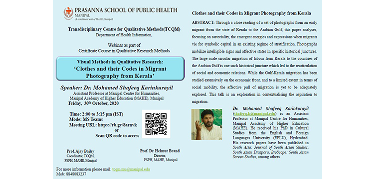 The Transdisciplinary Centre for Qualitative Methods is organizing a webinar on ‘Visual Methods in Qualitative Research: Clothes and their codes in migrant Photography from Kerala’ through Microsoft Teams on October 30, 2020 (Friday), 14:00-15:15 hours IST.