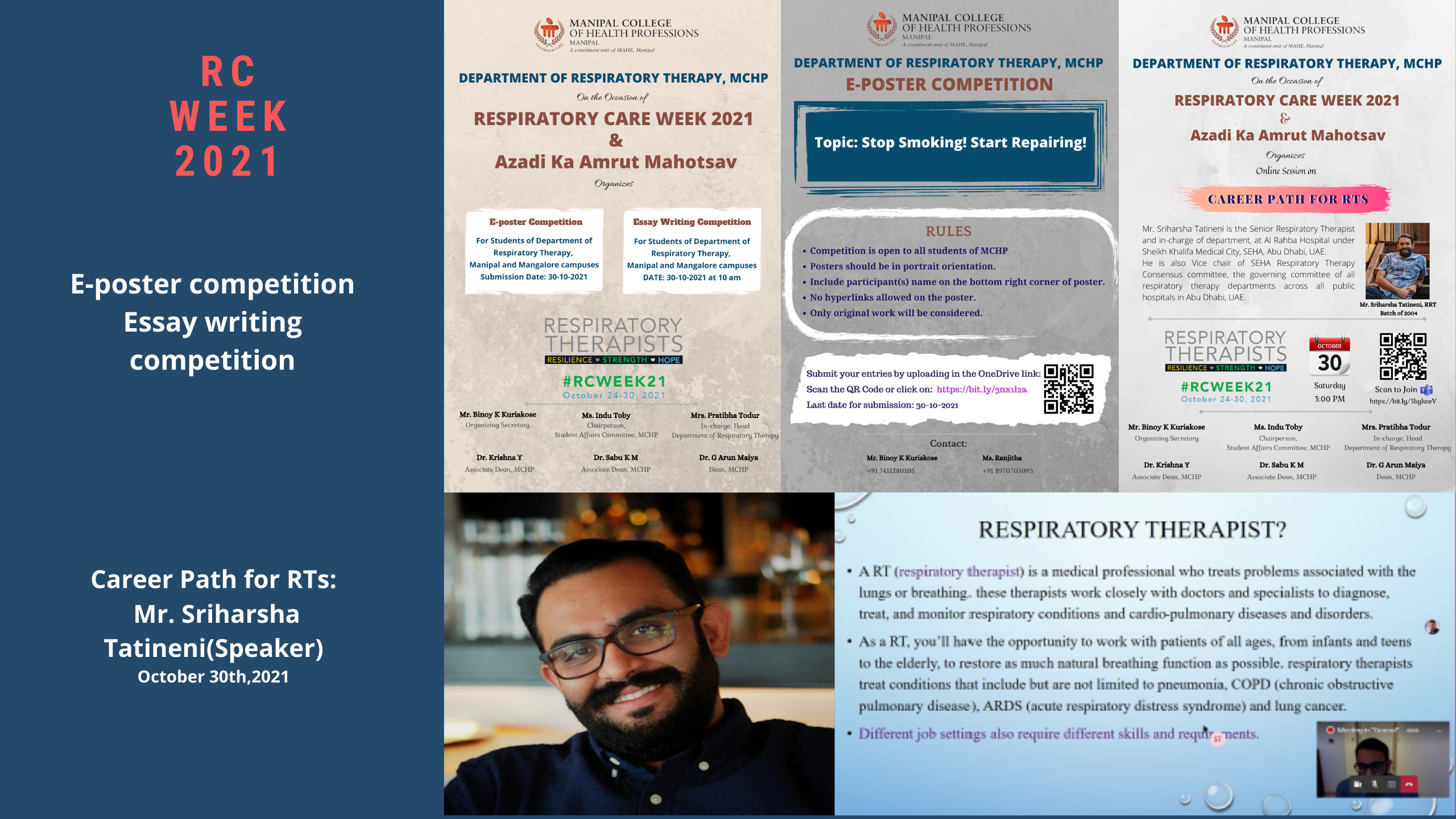 The main event of the Respiratory Care Week was an online session on Career Path for RTs. The session intended to address and alleviate any concerns of the Respiratory Therapy students regarding higher education and their job prospects. The resource person for the session was an alumnus of the Department of Respiratory Therapy, MCHP and a former faculty member at the Department, Mr. Sriharsha Tatineni, RRT. Mr. Sriharsha Tatineni is the in-charge of department, at Al Rahba Hospital under Sheikh Khalifa Medical City, SEHA, Abu Dhabi, UAE and is also the Vice chair of SEHA Respiratory Therapy Consensus committee (the governing committee of all respiratory therapy departments across all public hospitals in Abu Dhabi, UAE).