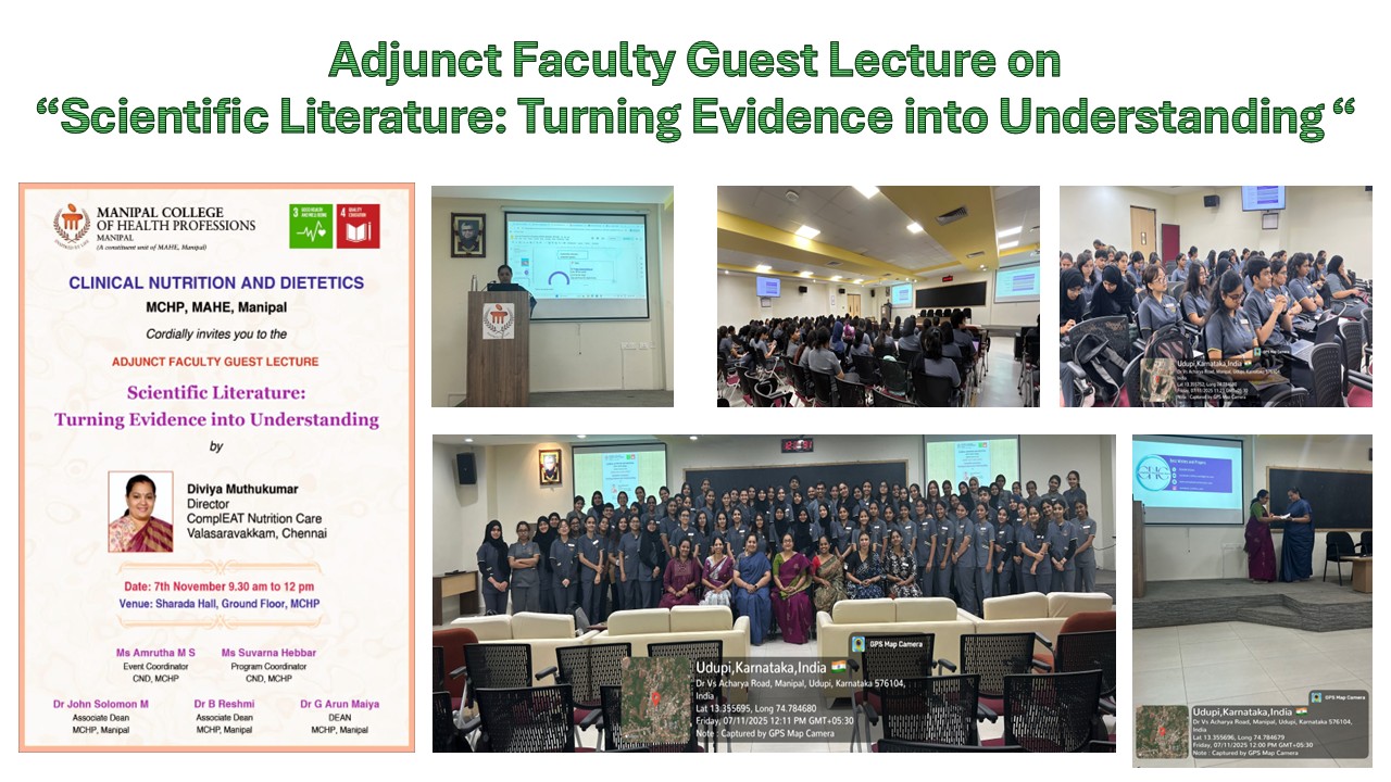 The Division of Clinical Nutrition and Dietetics, Manipal College of Health Professions (MCHP), MAHE, Manipal, organized an Adjunct Faculty Guest Lecture on 7th November at Sharada Hall. The session, titled “Scientific Literature: Turning Evidence into Understanding,” was delivered by Diviya Muthukumar, Director of ComplEAT Nutrition Care, Chennai. The event aimed to enhance students’ skills in interpreting scientific evidence. Faculty members and students actively participated, making the session highly informative and engaging.