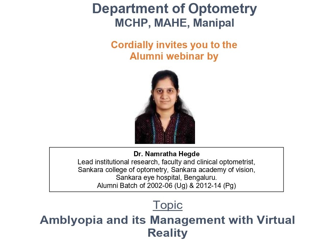 The Department of Optometry, MCHP, MAHE, Manipal, organised an alumni webinar on 04th February 2026 at 2:30 PM at the Pre-clinical Lab, 3rd Floor, MCHP, MAHE, Manipal. The event was conducted as part of the department’s ongoing alumni engagement initiatives to promote academic enrichment and