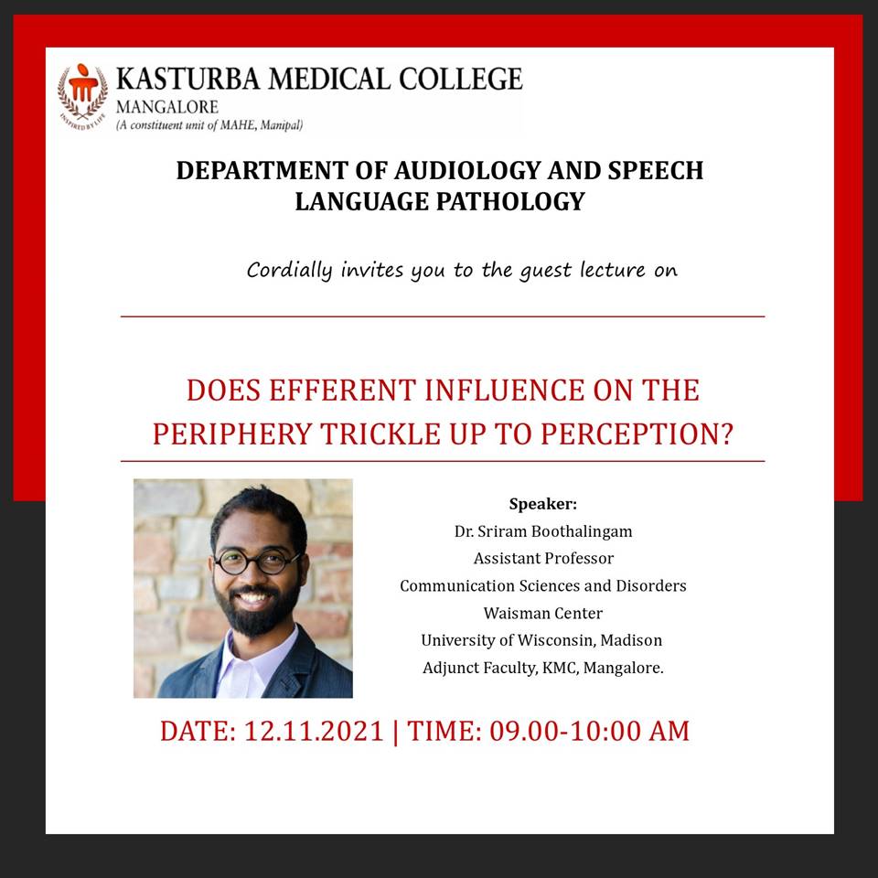 'Does Efferent Influence on the Periphery Trickle up to Perception?' by Dr. Sriram Boothalingam, Assistant Professor, Communication Sciences and Disorders, Waisman Center, University of Wisconsin, Madison, Adjunct Faculty, KMC, Mangalore.