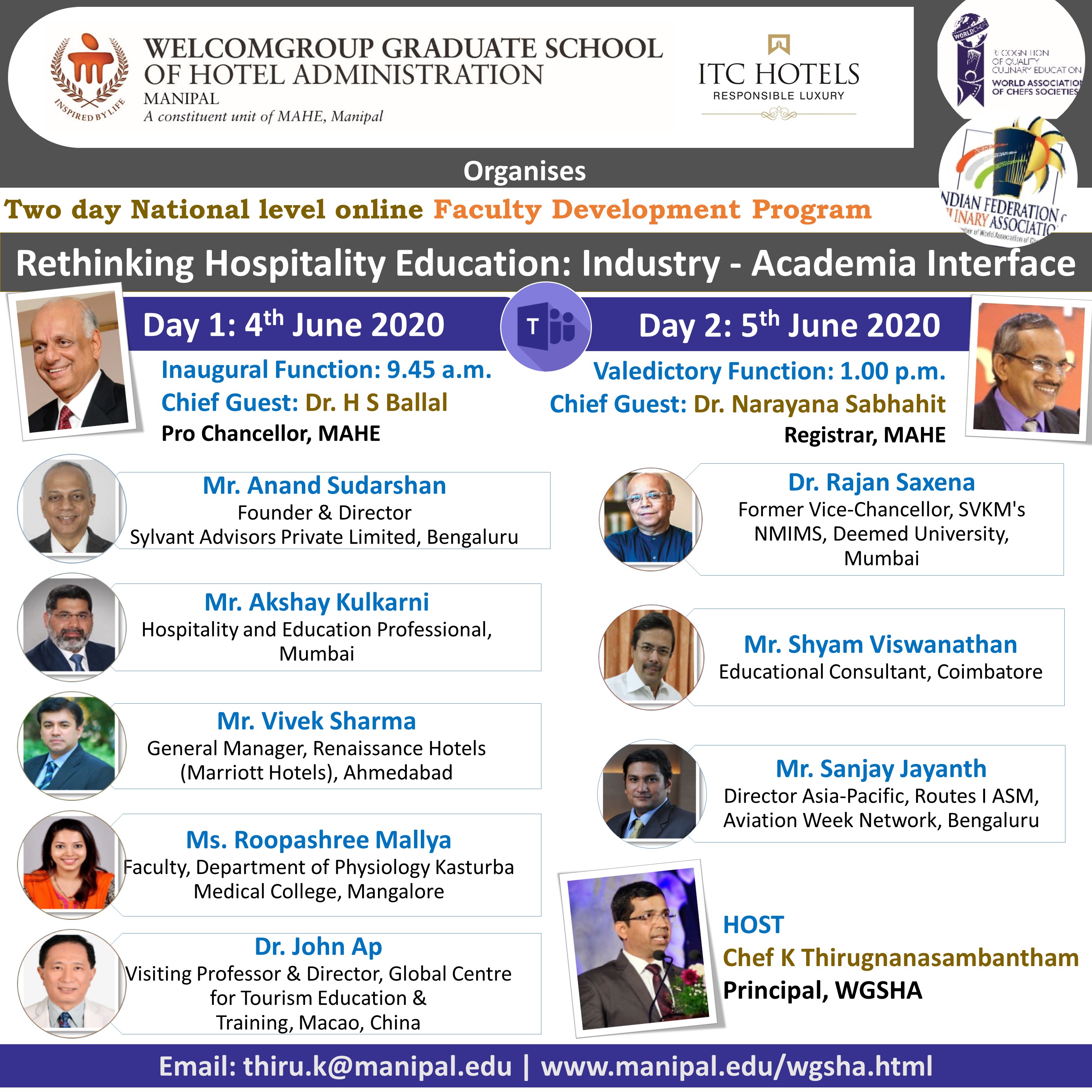 Welcomgroup Graduate School of Hotel Administration (WGSHA), Manipal Academy of Higher Education (MAHE), Manipal organized a two day national level online Faculty Development Program (FDP) on ‘Rethinking Hospitality Education: Industry-Academia Interface’ on 4th & 5th June, 2020 through Microsoft Teams with a series of webinars on eight contemporary sessions by senior professionals & experts. There were more than 100 faculty members of hospitality & tourism fraternity from across India to partake in this event, which was organized to equip hospitality educators on contemporary teaching & research proficiency that facilitates to bridge the gap between academia and industry.