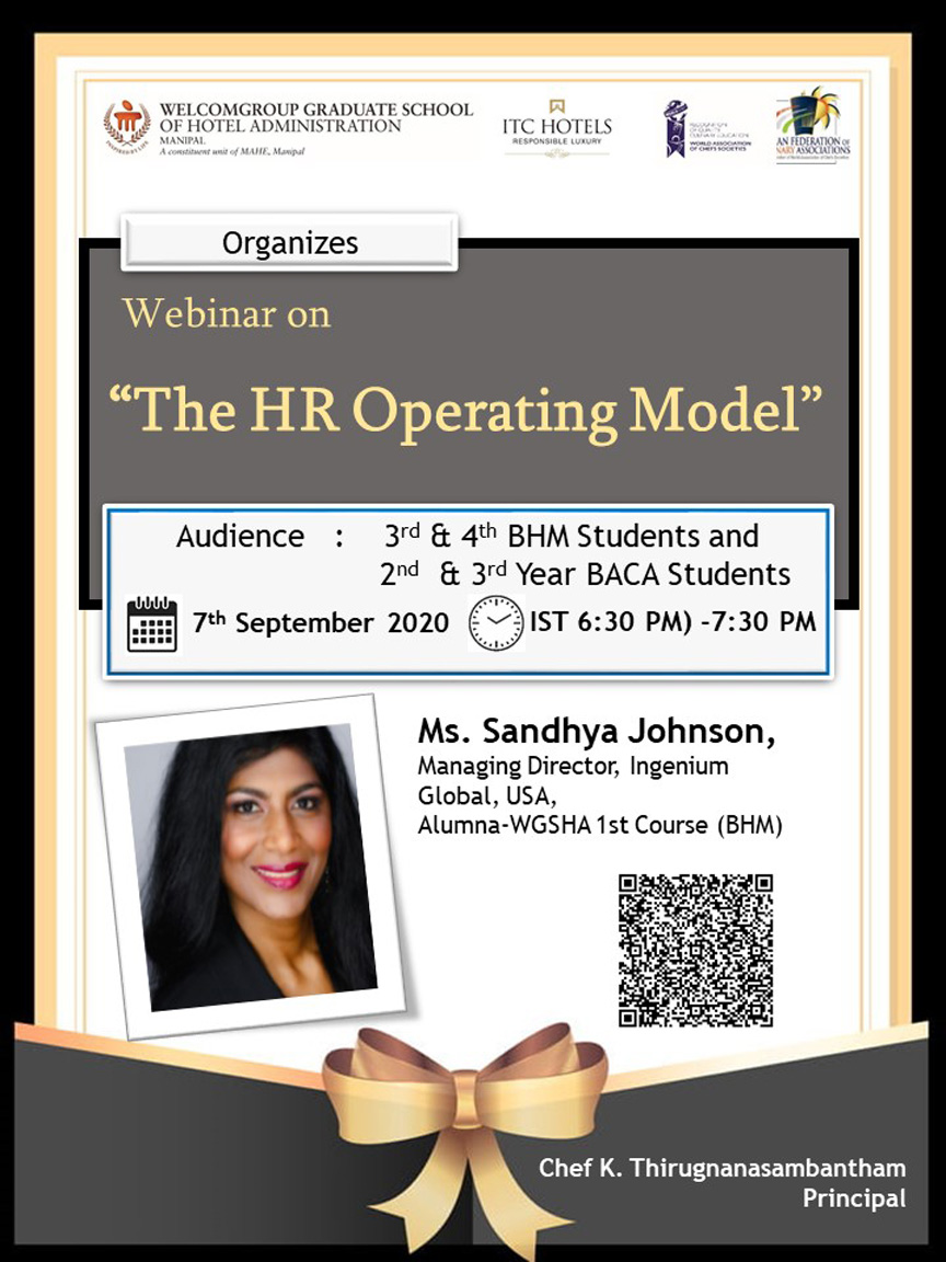 Webinar of “The HR Operating Model” by Dr. Sandhya Johnson, Managing Director, Ingenium Global, USA on Monday (7th Septemeber) at 6.30 pm.  Sandhya is the proud Alumna of 1st course BHM who is one of the well accomplished entrepreneur and  HR and Leadership Consultant.