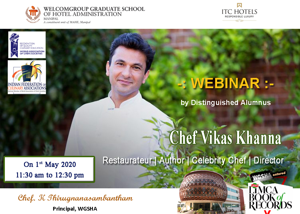 A webinar is scheduled from 11:30 am to 12:30 pm by our Distinguished Alumnus Dr. Chef Vikas Khanna - Restaurateur | Author | Celebrity Chef | Director. He will be addressing aspiring Hotel Management and Culinary Arts students.
